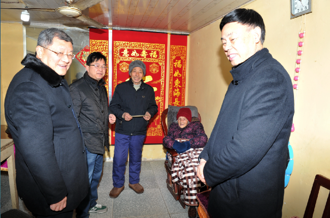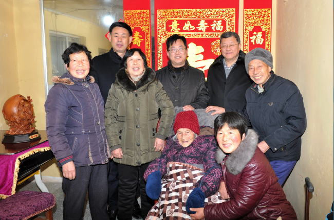 “我們黨政工領(lǐng)導來給您拜年了!”王進強一進門就對坐在沙發(fā)上的百歲老人說。