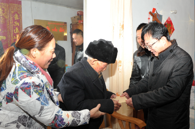 “今天我們代表農(nóng)場的黨政工領(lǐng)導一起來慰問百歲老人,祝愿老人福如東海、壽比南山。”王進強一邊把一封裝有慰問金的信封交到老子的兒女手中,一邊熱情地說道。