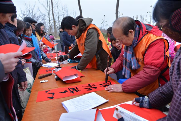 下午3時,場子一鋪開,書法愛好者們揮毫潑墨、筆走龍蛇,不一會兒,一幅幅珍貴的墨寶便誕生在紅彤彤的正丹紙上,一句句祝福的話語,寄托著職工居民對農(nóng)歷新年的憧憬和向往?;顒蝇F(xiàn)場,前來領取春聯(lián)的職工居民三五成群,熱鬧非凡,其中,“春回大地,福滿人間”等大紅喜聯(lián)最受歡迎,不一會兒便被搶選一空。