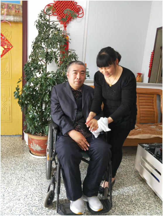 2003年1月2日早晨,一場(chǎng)意外的到來(lái)徹底打碎了苗新平平靜祥和的生活,丈夫王慶中在東灘工區(qū)爬電線桿進(jìn)行電工作業(yè)時(shí),不慎從高處跌落,導(dǎo)致頸椎嚴(yán)重摔傷,突如其來(lái)的打擊猶如晴天霹靂,經(jīng)過(guò)一個(gè)多月的搶救,丈夫的性命總算保住了,卻落下了四肢癱瘓后遺癥,日常起居只能靠坐輪椅。經(jīng)殘疾鑒定,王慶中為肢體殘疾一級(jí)。為了專心照顧丈夫,苗新平辭去了工作,給丈夫治病家里的積蓄很快都花完了,還欠了一屁股的債。盡管內(nèi)心忍受著巨大的煎熬,但她每天還是面帶微笑開導(dǎo)、安慰丈夫,哄他開心。癱瘓?jiān)诖驳恼煞蛏畈荒茏岳恚赀~體弱的公婆也需要有人照顧,這讓苗新平憧憬的幸福夢(mèng)變得支離破碎。然而,生活中的不幸并沒有壓垮苗新平,反而讓她更加堅(jiān)強(qiáng)地面對(duì)生活,重新?lián)P起生活的風(fēng)帆。從此,當(dāng)別人早已進(jìn)入夢(mèng)鄉(xiāng)的時(shí)候,苗新平還在忙著收拾家務(wù);當(dāng)別人睡眼朦朧地醒來(lái),苗新平早已為家人準(zhǔn)備好了飯菜。由于丈夫長(zhǎng)期癱瘓?jiān)诖玻笮”闶Ы钌贤耆荒茏岳恚浑x不棄,不厭其煩,精心侍候,每天總是按時(shí)為丈夫擦背按摩、端屎端尿、喂飯喂藥、翻身擦洗,為了減輕丈夫的病痛、消除心理壓力,天氣好的時(shí)候,苗新平還經(jīng)常推著坐在輪椅上的丈夫到公園或周邊轉(zhuǎn)轉(zhuǎn),夫妻兩人溫馨默契。十五年來(lái),在苗新平的精心照顧下,丈夫全身沒起過(guò)褥瘡,沒生過(guò)痱子,沒摔過(guò)跤,還慢慢地長(zhǎng)胖了。