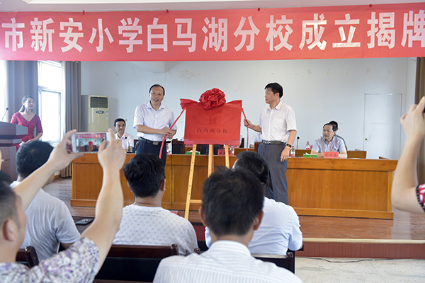 張大冬和白馬湖學校總校長工楊國東代表合作雙方簽定聯合辦學協議,姚春華、咸勇為淮安市新安小學白馬湖分校揭牌。