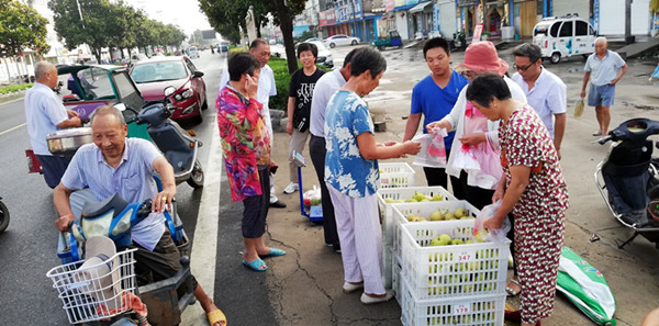自7月15日三河梨園采摘季開始以來,三河社區的6名工作人員便從管理人員的角色轉變為“賣貨郎”,每天清晨天不亮,修士超、張偉等6名年輕的管理人員便每天堅持將精品包裝撿挑余下的四級梨分散到農場農貿市場和周邊鄉鎮的集市去賣,他們街邊擺攤設點叫賣的吆喝聲吸引得不少大爺大媽的圍觀并爭相購買三河梨,大家一邊買梨一邊樂呵呵的說,現在的干部可真行,賣起來梨來也是有模有樣的。
