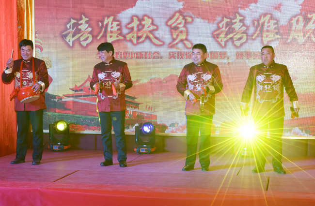 下場:咚咚咚咚嗆、咚咚咚咚嗆、咚咚咚咚嗆嗆、咚咚咚咚嗆(圖為團拜會上精準扶貧政策好三句半劇照。)