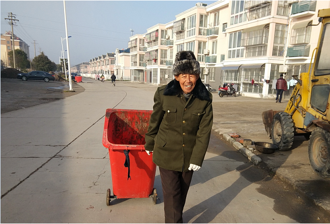 李朋友做事認真,教育孩子也不含糊,要他們好好學習,掌握技能,子孫們自食其力地生活,這讓李朋友很欣慰。老人在兒孫中威望極高,逢年過節20多個子孫紛紛來到家中團聚,給老人帶來禮品,老人的晚年生活充滿了歡樂。圖為李朋友拖著垃圾桶在保潔。