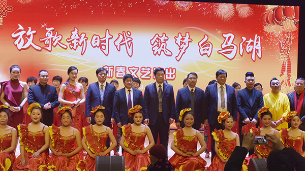 大會緊接著還舉行了“放歌新時代、筑夢白馬湖”新春文藝演出。姚春華在演出前作了熱情洋溢的致辭。來自江蘇青春歌舞團(tuán)的演員及白馬湖駿逸舞蹈隊的隊員們?yōu)榕c會代表及部分職工居民們帶來了《盛世龍騰耀中華》《春天的故事》《春雨沐浴白馬湖》等十多個精彩的文藝節(jié)目,整場演出最后在舞蹈《不忘初心 砥礪前行》中落下了帷幕。