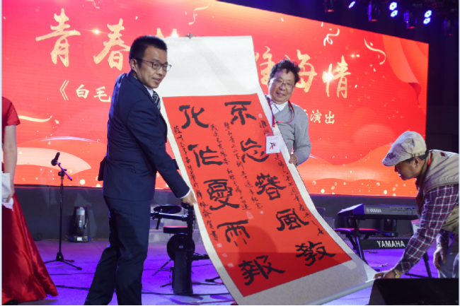 4月18日在淮海農場文化廣場舉行的青春夢、淮海情《白毛女》劇組重回第二故鄉專場演出活動上,原淮海農場紅旗分場十四連的蘇州知青,近70歲的畢培華特地書寫了一幅“不忘春風教 化作夏雨報”裝裱好的書法豎軸,為《白毛女》劇組時隔五十年重回淮海農場演出助興。圖一為畢培華在舞臺上捐贈書法豎軸;圖二為畢培華和老友在毛澤東發布的“生產待命、建設農場”命令碑文前展示豎軸書法時的鏡頭。