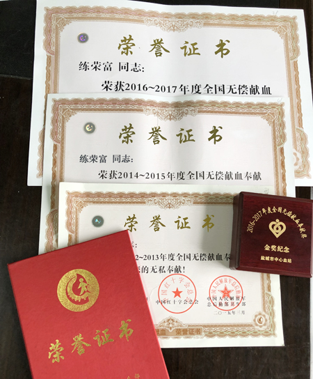 近日,?港農場供電服務公司職工練榮富收到了2016~2017年度全國無償獻血奉獻獎金獎榮譽證書和鹽城市中心血站頒發的2016~2017年無償獻血奉獻獎紀念銀章。榮譽證書由國家衛生健康委員會、中國紅十字總工會、中央軍委后勤保障部衛生局2018年10月聯合頒發。