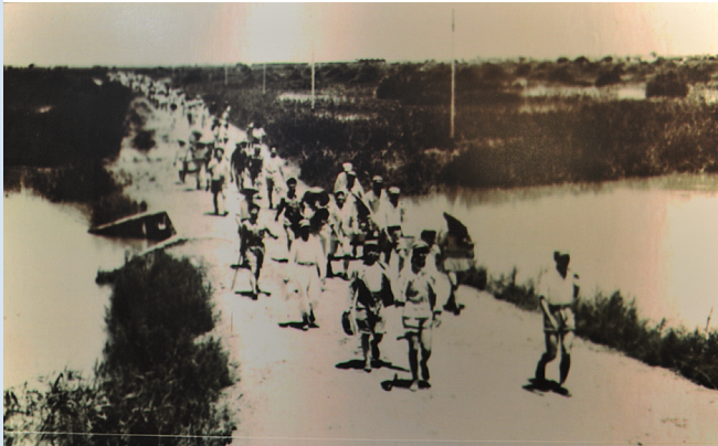 在一天雨后晴朗的日子,五月的太陽照得大家暖和和的,黃錦穩(wěn)和他的保苗小組繼續(xù)在田間工作著,他們望著在雨后陽光中直挺起來的小麥,一日不同一日,愈長愈秀了,大家看了真是說不出的高興,都說:“我們幾天的辛勞到底沒有白費,再努力一個時期,我們就可以看到自己的勞動果實——金黃色的麥粒了。”圖為農(nóng)建四師戰(zhàn)士奔赴搶險第一線時的鏡頭。