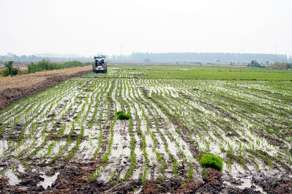 6月13日上午,筆者來到邱上郢生產區,只見上水、插秧、水直播等正在緊張的進行之中,不少直播田塊秧苗已成行,已插的田塊也是綠油油的一片。自轉戰夏插夏管以來,該生產區的所有管理人員一心撲在夏插上,今年嚴峻的干旱形勢讓他們時刻繃著“與天爭時、與地爭早”的這根弦,在大王電站旁的水直播現場,筆者看到生產隊長丁德康正在打水,他告訴筆者,今年的干旱使得他們打水特別緊張,由于田旋耕后無法及時上水,時間長了,水一進田便立刻沖垮了田間的埂和溝渠疊加的壩子,因為泥土全部成了粉末狀,一沖便散了,他們需要再重新疊壩打埂。
