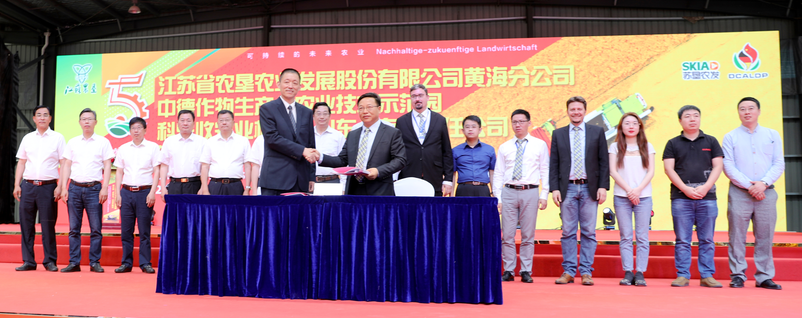 中德示范園主任賀在銳與科樂收農(nóng)業(yè)機(jī)械(山東公司)首席執(zhí)行官分別代表中德示范園與科樂收公司簽署合作協(xié)議。