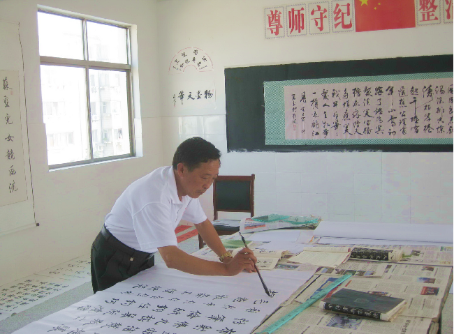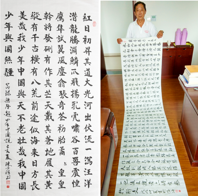 所悉,陳必祥無論在教學中還是平時的休閑時間,多年來一直潛心研究書法藝術,是中國書畫家協(xié)會理事,作品多次獲得國家和省、市、縣大獎。每次農(nóng)場公司書畫書法協(xié)會組織作品展示時,他都要寫出幾張作品應征。圖為陳必祥在展示書法和作者近照。