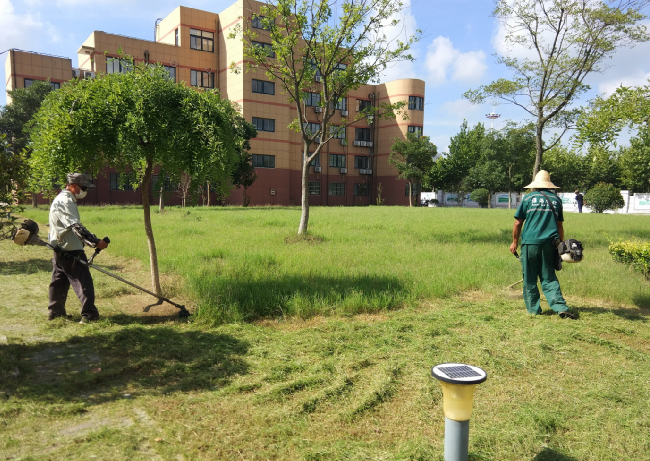 正是由于這些環衛職工不畏熱浪的襲擊,他們的奉獻和一絲不茍的認真操作,讓淮海平整、干凈、養眼的綠色的綠化環境一直呈現在我們眼前。圖為環衛職工在修剪草坪時的鏡頭。