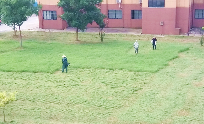 十幾公斤重的剪草機背上一會兒還可以,如果在烈日下連續背上幾十分鐘,而且還要帶動連桿一頭懸空的剪草機頭,來回左右地掃動的草的基部,那工作的勞累程度可想而知。特別是修剪草坪還是在烈日下,絲毫沒有蔭涼可乘,一個個修剪草坪的師傅黝黑的臉龐上們滿頭大汗,他們那布滿草屑的衣背上濕了一大片,從中可見他們辛苦的程度。他們的前方是竄高并雜亂的雜草,身后猶如一個人剃了頭似的看了干凈清爽。