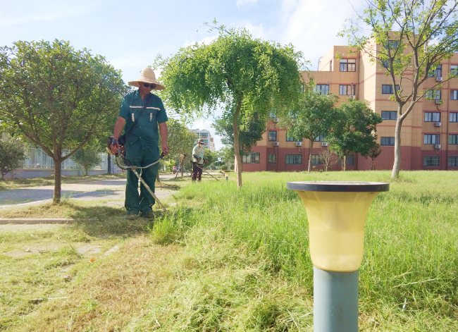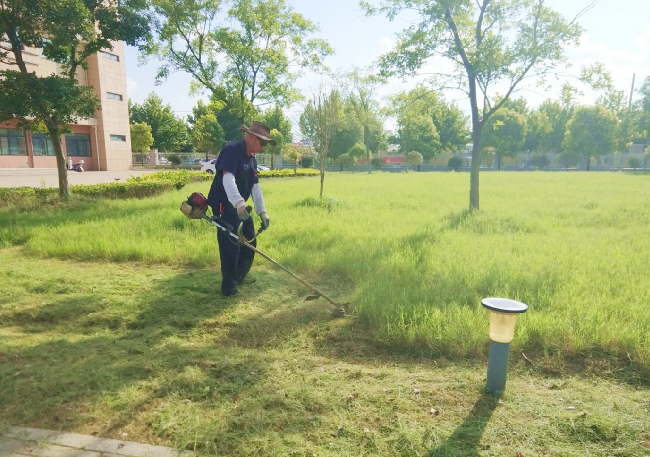 而在農場公司公園中、路邊公園里或是小區、辦公場所里,不時響起的馬達轟鳴聲,仿佛在與高溫一起轟鳴。循聲望去,只見三位淮海綠化環衛所的職工正頂著烈日,揮汗如雨地在修剪草坪。