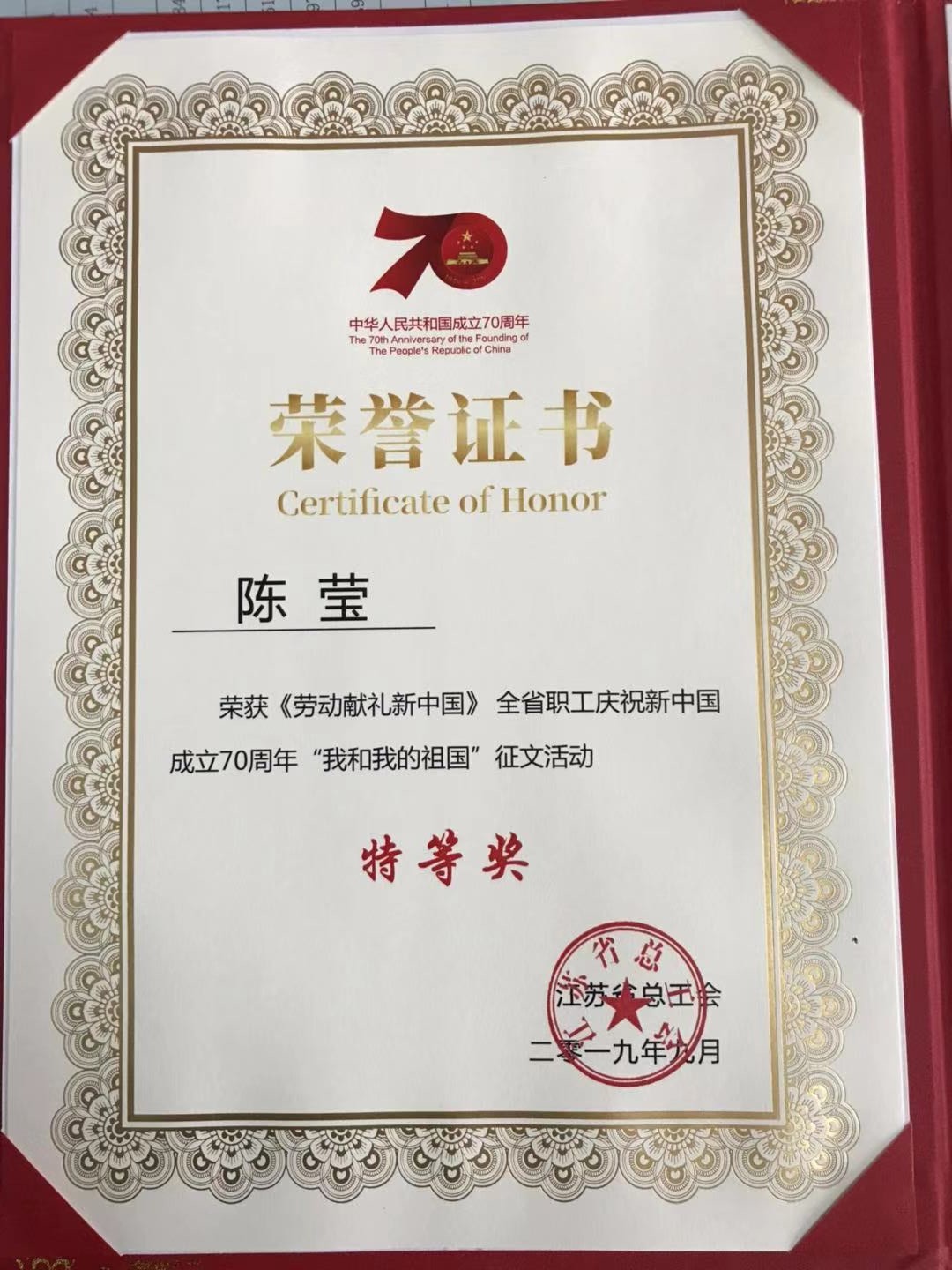 經(jīng)農(nóng)墾物業(yè)公司工會(huì)和集團(tuán)工會(huì)推薦,物業(yè)公司職工陳瑩同志以《假如我有一臺(tái)時(shí)光機(jī)》一文參加《勞動(dòng)獻(xiàn)禮新中國(guó)》全省職工慶祝新中國(guó)成立70周年“我和我的祖國(guó)”征文活動(dòng)并榮獲特等獎(jiǎng)。該活動(dòng)共收到文稿5204封,特等獎(jiǎng)10人,陳瑩代表江蘇農(nóng)墾獲得榮譽(yù)。