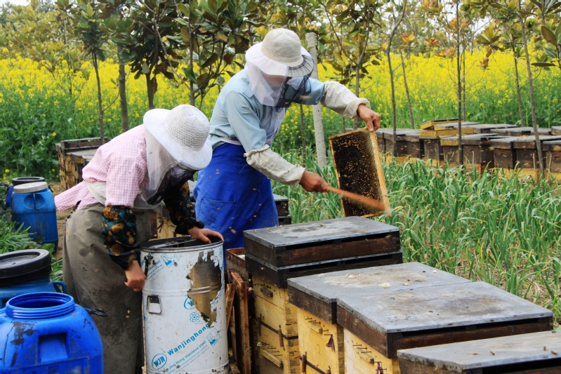 圖為賀師傅夫婦正在收菜花蜜