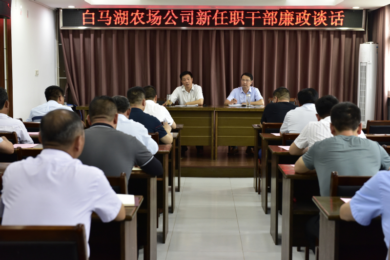 為切實(shí)落實(shí)全面從嚴(yán)治黨主體責(zé)任,提高新任職干部對黨風(fēng)廉政建設(shè)重要性的認(rèn)識,筑牢新任職干部廉潔自律的防線,7月2日下午,白馬湖農(nóng)場公司對40多名新提拔或崗位調(diào)整任新職干部開展集體廉政談話,黨委書記姚春華、紀(jì)委書記韓躍武分別進(jìn)行談話。