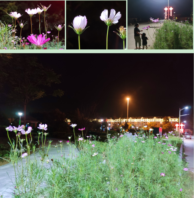 在淮海農場醫院門前的健康路上,生長著約幾十米長的秋英花,白天盡顯嫵媚,成為健康路途中的一道別樣風景,而到了夜晚在燈光的映襯下,秋英也就更具特色,像是一朵朵唯美的風景,讓人流連中又不忍去碰它,生怕觸動它那嬌嫩的肌膚。這些花朵與農場大面積栽種的綠植不同,因為它是草本植物,也就成為了農場綠化家族中的新一景,吸引著人們駐足觀看,也讓美麗淮海增添了一處新的觀光地帶。