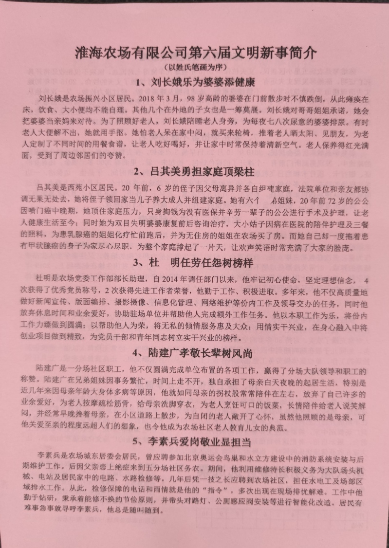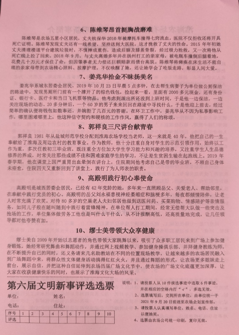 一批又一批文明新事,在淮海文明的土壤上層出不窮,那些見義勇為、孝老愛親、助人為樂、拾金不昧、敬業奉獻等文明新事宣傳,正與農場軍墾傳統文化相融相合,并向全社會展示出“淮海好人”的最美故事和普通職工的別樣風采。圖為淮海農場有限公司發放的第六屆文明新事簡介宣傳和填表單。