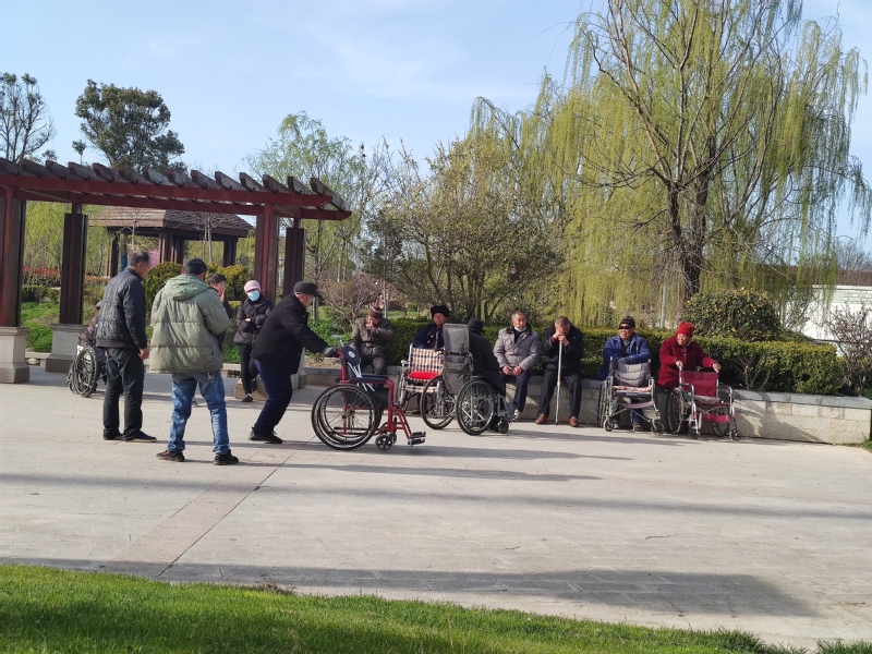 我們發(fā)現(xiàn),來這里休憩的老人中,推著輪椅來的老人特別的多,這些老人中,有自己轉(zhuǎn)著輪椅過來的,也有兒女推著他們過來的。“我爸總是讓我將他推到公園中來,他就喜歡與同齡人在一起熱鬧熱鬧,這樣他的心情才舒暢。”胡鐵成的兒子將老人推到公園坐椅著時(shí)對(duì)我說,“老人怎么說怎么好,我們做兒女的,滿足下他們的心愿就好了。圖為老人們?cè)谝黄鸾徽剷r(shí)的鏡頭。