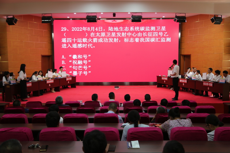 本次比賽分為兩個階段進行,在6月25日的預賽中,全場18支代表隊進行了筆試考核,通過每隊總比分,選出了今天6支參加決賽的隊伍。在主持人的宣布下,比賽正式拉開帷幕?!罢埪狀},黨的二十大報告指出……請開始搶答。”“請1號臺答題,三號臺搶答犯規……”在現場,6支代表隊“八仙過海各顯神通”,大家“邊賽邊學”、“以賽促學”,在必答題、搶答題和風險題3個環節上充分發揮團隊力量,傾力配合。各支代表隊你追我趕,互不相讓,臺下觀眾也聚精會神,對著屏幕學習黨的二十大知識,現場不時發出熱烈的掌聲。在每個環節休息階段,大會還組織開展了現場互動答題,并準備了精美禮品。現場觀眾紛紛踴躍搶答,再度將本次競賽活動氣氛推向了頂峰。