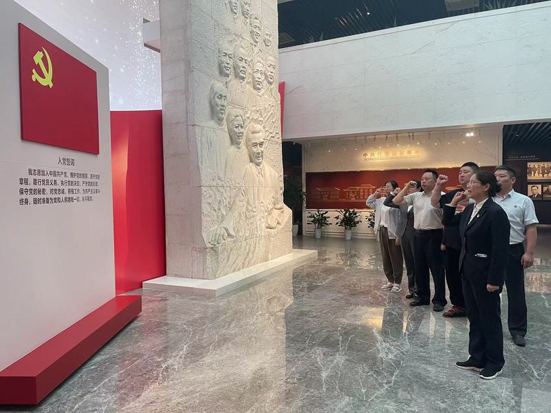 首先,全體黨員來(lái)到陳列廳正中央,面對(duì)漢白玉浮雕和鮮紅的黨旗重溫入黨誓詞,回顧入黨時(shí)的莊嚴(yán)承諾和初心使命,進(jìn)一步增強(qiáng)理想信念。隨后,全體人員參觀了國(guó)共南京談判史料陳列館,認(rèn)真觀摩館內(nèi)陳列的歷史文獻(xiàn)、展板、影像等,在一幅幅泛黃的照片、一件件簡(jiǎn)樸的實(shí)物、一段段珍貴的影像資料前駐足凝視。周恩來(lái)戴過的禮帽、代表團(tuán)的戶口卡、董必武的銅墨盒,一件件珍貴的文物,帶領(lǐng)大家穿越時(shí)光,回到共和國(guó)誕生前的至暗時(shí)刻,讓大家切身感受了以周恩來(lái)為代表的共產(chǎn)黨人高尚的品格情操、堅(jiān)定的理想信念、無(wú)畏的革命精神。隨后大家不約而同地駐足在習(xí)總書記在紀(jì)念周恩來(lái)同志誕辰120周年座談會(huì)上對(duì)于周總理褒獎(jiǎng)的文字前,這“六個(gè)杰出楷?!闭菓?yīng)當(dāng)樹立的標(biāo)桿和榜樣。參觀結(jié)束后,支部黨員們集體過“迎七一,共憶入黨初心”政治生日,支部書記為大家發(fā)放“政治生日”賀卡,勉勵(lì)大家要進(jìn)一步強(qiáng)化身份意識(shí)、宗旨意識(shí)和責(zé)任意識(shí),恪守初心使命,永葆政治本色,永遠(yuǎn)跟黨走。
