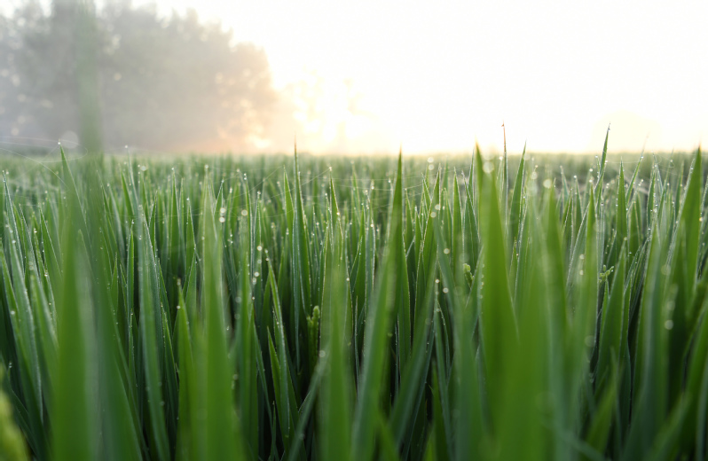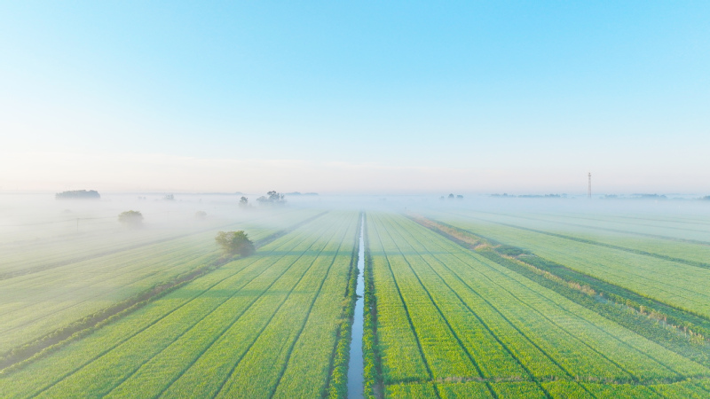 陽(yáng)光下,霧氣散,空氣中彌漫著清新的稻花香。俯瞰蔥綠的稻田,如一條條綠絲帶整齊排列。晶瑩的晨露凝結(jié)在青翠的秧苗上,猶如給稻田蒙上了一層剔透的面紗。剛抽出的稻穗上,有白色的稻花點(diǎn)點(diǎn),隨著稻穗一起隨風(fēng)輕舞飛揚(yáng)。小蜘蛛也趕來(lái)湊個(gè)熱鬧,在枝葉上織起了“秋的毛衣”。