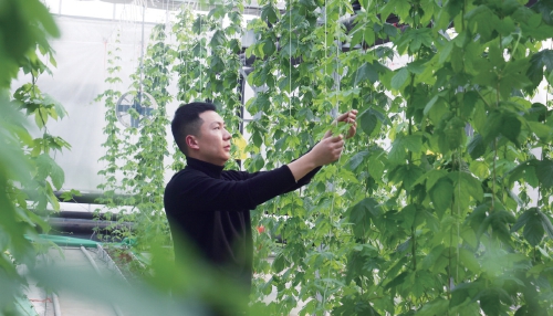 江蘇農墾集團云臺農場利用資源優(yōu)勢,積極與龍頭企業(yè)、科研機構對接,開發(fā)特色種植。目前,與蘇墾麥芽公司訂單種植的大棚啤酒花長勢喜人。圖為技術人員正在為新長出的啤酒花側枝繞蔓。 程軍 攝