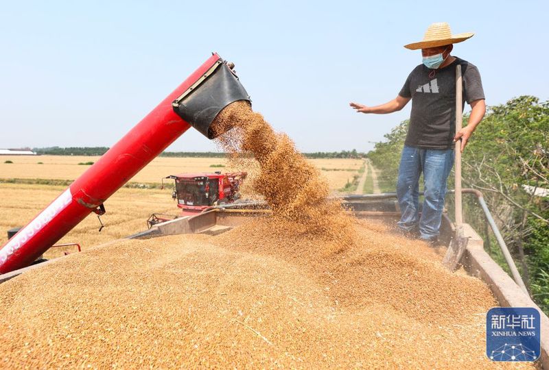 5月28日,江蘇農(nóng)墾三河農(nóng)場(chǎng)職工在裝車(chē)收割的小麥。新華社發(fā)(許昌銀攝)