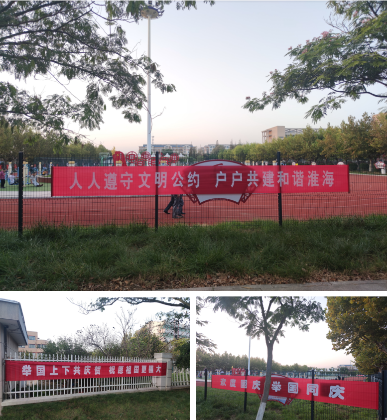 五星紅旗隨風(fēng)招展,喜悅之情更是承載著人們對(duì)美好未來的向往。轄區(qū)升掛的國旗,懸掛國慶標(biāo)語,文廣苑樓體上“人民有信仰 國家有力量 民族有希望”等主題宣傳標(biāo)語等格外醒目,加上農(nóng)場(chǎng)在各個(gè)廣場(chǎng)上開展的群眾性文化體育活動(dòng)及廣大職工居民進(jìn)行休閑健身的鏡頭,既呈現(xiàn)出了淮海職工居民在祖國大家庭懷抱里安定團(tuán)結(jié)祥和的良好社會(huì)氛圍,也再一次激發(fā)著農(nóng)場(chǎng)廣大黨員干部和職工群眾對(duì)黨、對(duì)祖國母親的無盡熱愛,昭示著廣大干部群眾在中國共產(chǎn)黨的領(lǐng)導(dǎo)下,感黨恩、聽黨話、跟黨走的信心和決心。圖為淮海在國慶期間懸掛的宣傳廣告橫幅。