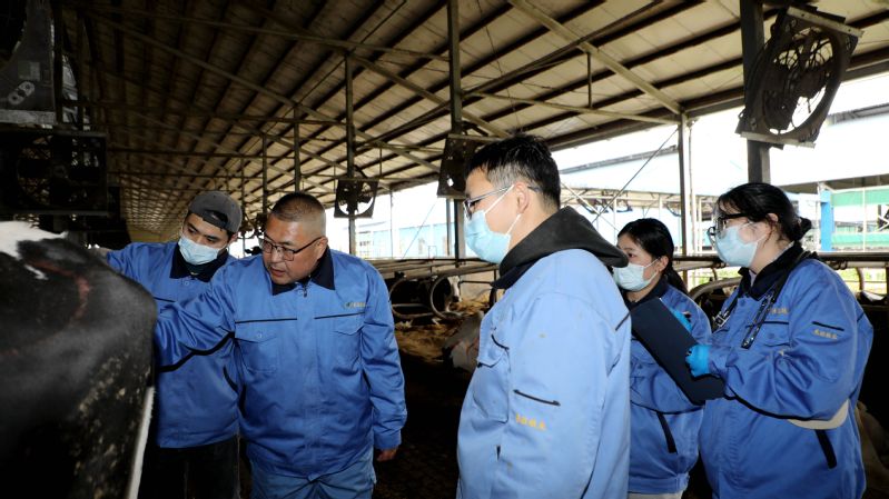 “從外部叩診聲音判斷,這頭牛的肺部已由清音轉為濁音,聽診器中也有明顯的氣泡炸裂聲,要馬上進行治療?!?1月19日下午,在東辛東旺奶牛公司生態養殖示范場,一場現場教學正在進行,獸醫主管周文波正帶領獸醫組人員對病癥牛只開展日常巡診。通過觸診、視診、嗅診、聽診、叩診等診斷方法,認真細致檢查牛只體況,周文波“手把手”傳授獸醫組人員如何快速準確診斷病因,做到對癥下藥?!?23180號奶牛奶液出現明顯絮狀物,使用頭孢噻呋乳注搭配美洛昔康皮下注射進行治療。213722號奶牛體溫升高,要做好提前干預。在日常巡舍中一定要多觀察多診斷,才能及時發現奶牛體征異樣?!敝芪牟ㄟ叢榭磁V粻顩r邊叮囑獸醫組人員。東旺奶牛公司生態養殖示范場存欄奶牛4800余頭,日常的奶牛管護、產后護理、轉群分群及病牛治療等工作任務十分繁重,獸醫組嚴格遵循“日巡查+周例會+月巡診”的工作機制,通過巡棚查看、巡診交流,全面了解掌握牛只的健康與成長狀況,做到有檢查、有治療、有回診,保障疫病防控和奶產品安全供給。“每個月,周主管都會定期帶我們進行巡診,現場診斷指導,我們的業務水平有了明顯提升,工作起來也更得心應手了?!鲍F醫組工作人員楊華說。東