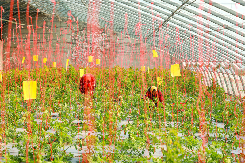走進云臺農場云水灣濕地公園番茄日光溫室大棚內,一排排番茄藤蔓爬滿吊繩,工作人員正在為番茄進行整枝和打叉,去除番茄植株上的多余側枝和側芽,以增加通風和光照,減少病害的發生,促進番茄健康生長。番茄種植管理,很重要的一個技術環節就是合理控制旺長,農技人員在今年春季番茄種植管理控旺技術上,采取“物理控旺為主、化學控旺為輔”的策略。通過移載活棵后5—6葉期,覆土壓蔓,再在第2—3苔果穗成形后,吊蔓,讓基部2至3個節間基本盤在地膜上。這種物理控旺的方法既能有效控制旺長,又能合理控制株高,免去了后期3次的落蔓工序,有效減少了每畝地400元的用工成本,不僅提高了生產效率,還降低了生產成本,為農場帶來了實實在在的收益?!白钤缫慌衙髂暌辉路菥涂梢陨鲜辛耍慨€地大概可以產出番茄5500-6000斤,我們的番茄口感好,許多顧客都說有‘兒時味道’,反復回購,價格也是居高不下,畝產值能達到5萬元。”番茄基地負責人榮偉樂呵呵地說道。云水灣濕地公園以口感型番茄為主,種有“草莓番茄”和“鐵皮柿子”兩種品種,與傳統番茄品種相比,對溫室大棚栽培的溫度、濕度、水分、光照、營養補給都有更加嚴格的要求,工作人員采取全過程精細
