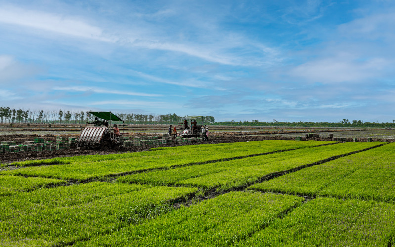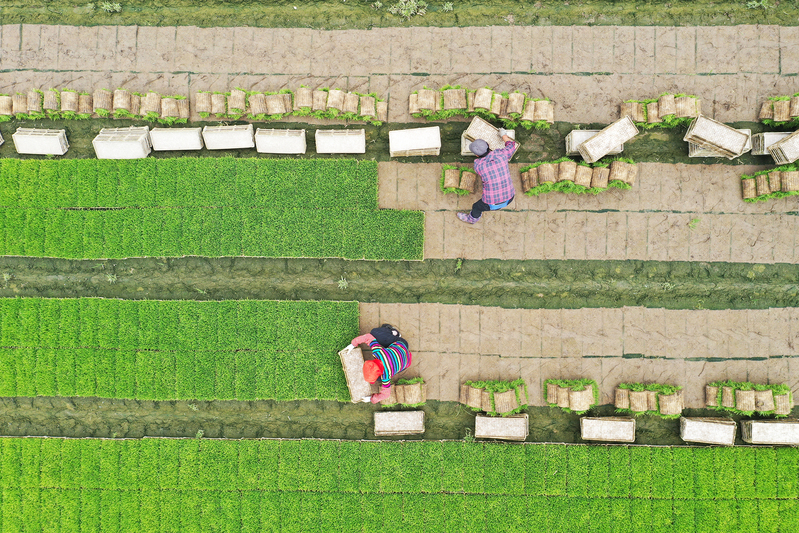 端午假期第一天,蘇墾農(nóng)發(fā)南通分公司3大隊(duì)田頭一片忙碌景象。烈日下,7位農(nóng)技人員彎著腰在水稻田一字排開移栽秧苗,腳下步履維艱、鼻頭汗珠滴落。按照隊(duì)伍兩頭農(nóng)技人員手拉的直線,他們小心翼翼地從秧盤上取下秧苗,左手握苗,右手插秧,確保行距25厘米,株距20厘米,每穴2株,橫豎成線、深度適中。每隔一段距離,田間都會(huì)插上一塊寫明實(shí)驗(yàn)數(shù)據(jù)的標(biāo)簽。“不同的標(biāo)簽對(duì)應(yīng)了不同的試驗(yàn)稻種。人工插秧可以確保水稻增產(chǎn)試驗(yàn)的科學(xué)性、嚴(yán)謹(jǐn)性、準(zhǔn)確性。”蘇墾農(nóng)發(fā)南通分公司農(nóng)業(yè)中心主任趙中華表示。今年,蘇墾農(nóng)發(fā)南通分公司大力推進(jìn)農(nóng)業(yè)科技創(chuàng)新,與南通大學(xué)生命科學(xué)學(xué)院合作開展水稻高產(chǎn)技術(shù)研發(fā),為南通稻米產(chǎn)業(yè)供給性結(jié)構(gòu)優(yōu)化、品質(zhì)提升、節(jié)本增效和綠色高產(chǎn)提供技術(shù)支撐。前期,校企雙方分別對(duì)南粳46、南粳5055稻種以微波、離心、超聲波等3種方式,按時(shí)間長(zhǎng)度各進(jìn)行32種處理。落谷前,蘇墾農(nóng)發(fā)南通分公司對(duì)不同品種、不同處理的水稻種子提前進(jìn)行了篩選、收集、稱重、貼標(biāo)、裝袋等準(zhǔn)備工作,同時(shí)與相關(guān)農(nóng)業(yè)大隊(duì)溝通協(xié)調(diào)好浸種催芽時(shí)間,在種子露白后及時(shí)安排工人與農(nóng)機(jī),掌握好落谷的最佳時(shí)機(jī)與最優(yōu)質(zhì)量,控制種子秧盤播撒的均勻度,精準(zhǔn)把控好土壤濕度與精細(xì)