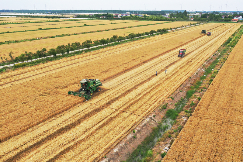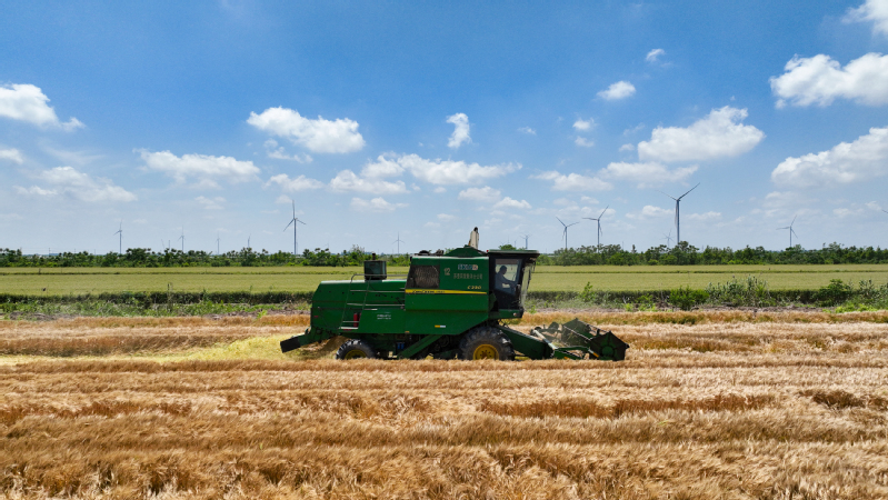 風吹麥田千重浪,麥粒漸滿穗金黃。5月22日中午,4臺約翰迪爾C2400大型聯合收割機開進了蘇墾農發濱淮分公司27大隊大麥田間,迎來了今年夏收“第一鐮”。伴隨著收割機陣陣轟鳴聲,一排排大麥被卷入收割機中,稻穗經過脫粒、碎桿等工序后收入機艙,輸送到運糧車上,并拖向場頭翻曬。半天時間,近300畝大麥收割結束。收割現場,農水中心和大隊管理人員在田間檢查收割質量?!斑@是我們今年‘三夏’的首次收割,我們前期對24臺收割機進行檢修、調試、保養,確保農機以最佳狀態投入到夏收工作中,務必要把收割損失率降到最低?!鞭r水中心副主任孟琪表示?!敖衲炅a區大麥單產有望超去年,按照‘三夏’動員會部署,堅持質量和標準化,搶抓晴好天氣開展收割作業,計劃在28日前完成六生產區的大麥收割工作,充分利用好把大麥的茬口優勢,奠定秋糧豐產基礎?!绷a區主任盧剛說。