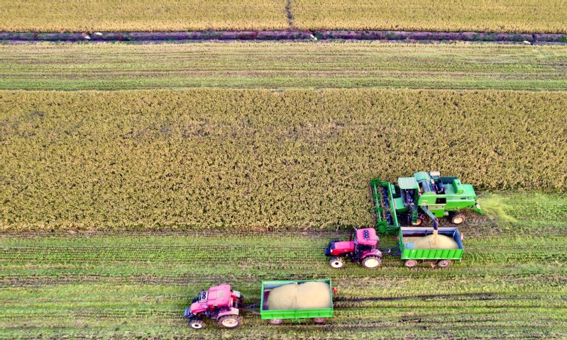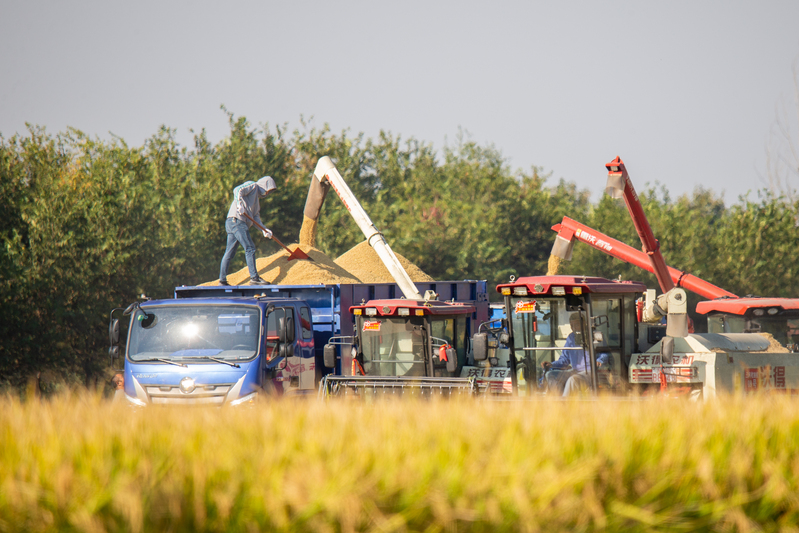 10月18日,在蘇墾農發新洋分公司高標準糧食曬場,工人們正在用機械翻曬新收獲的水稻,呈現一派繁忙的豐收景象。近年來,蘇墾農發新洋分公司深入實施“藏糧于地、藏糧于技”戰略,始終把糧食安全放在重要位置,加快推進高標準農田建設,全力提升糧食生產效率和水平。