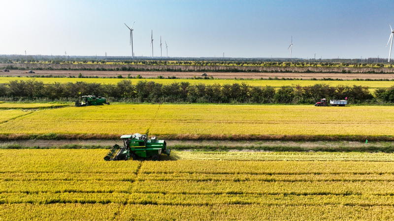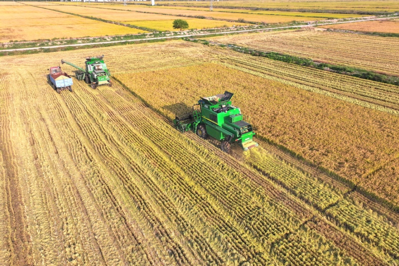 “開鐮了!豐收了!”10月17日上午10時,一臺臺聯合收割機駛向蘇墾農發新洋分公司新北生產區5大隊,金黃的水稻被大型機械收入“囊”中,新洋5.3萬畝水稻機收作業正式拉開序幕。今年“三秋”是集團公司第二次黨代會勝利召開后的第一個農忙,做好“三秋”工作意義重大,黨委班子成員靠前指揮,深入田間查看水稻收割情況。稻田接連成片,稻穗迎風擺動,收割機馬力全開、縱橫馳騁,收割、脫粒、裝車……一氣呵成,一派豐收的喜人景象。收割現場,蘇墾農發新洋分公司嚴格收割質量監督,把機械減損作為糧食增產的重點,加大收割質量檢查力度,減少收割損失,實現秋糧顆粒歸倉。“我們密切關注天氣情況和水稻成熟度,統籌安排,堅持質量第一,進度第二,努力做到成熟一塊收割一塊,穩步推進收割進度。”農業中心負責人介紹。蘇墾農發新洋分公司立足“前期‘揀’收、中期‘穩’收、后期‘搶’收”的原則,充分利用秋收早期溫度高,有利晾曬、烘干的條件,適時收、曬、烘,為秋播及時騰茬,確保11月6日前完成秋播田塊收割任務。面對不穩定天氣因素,蘇墾農發新洋分公司強化機械保障,本部準備收割機58臺套,運糧車53臺,另調度好26臺小型履帶式收割機,隨時應對突發